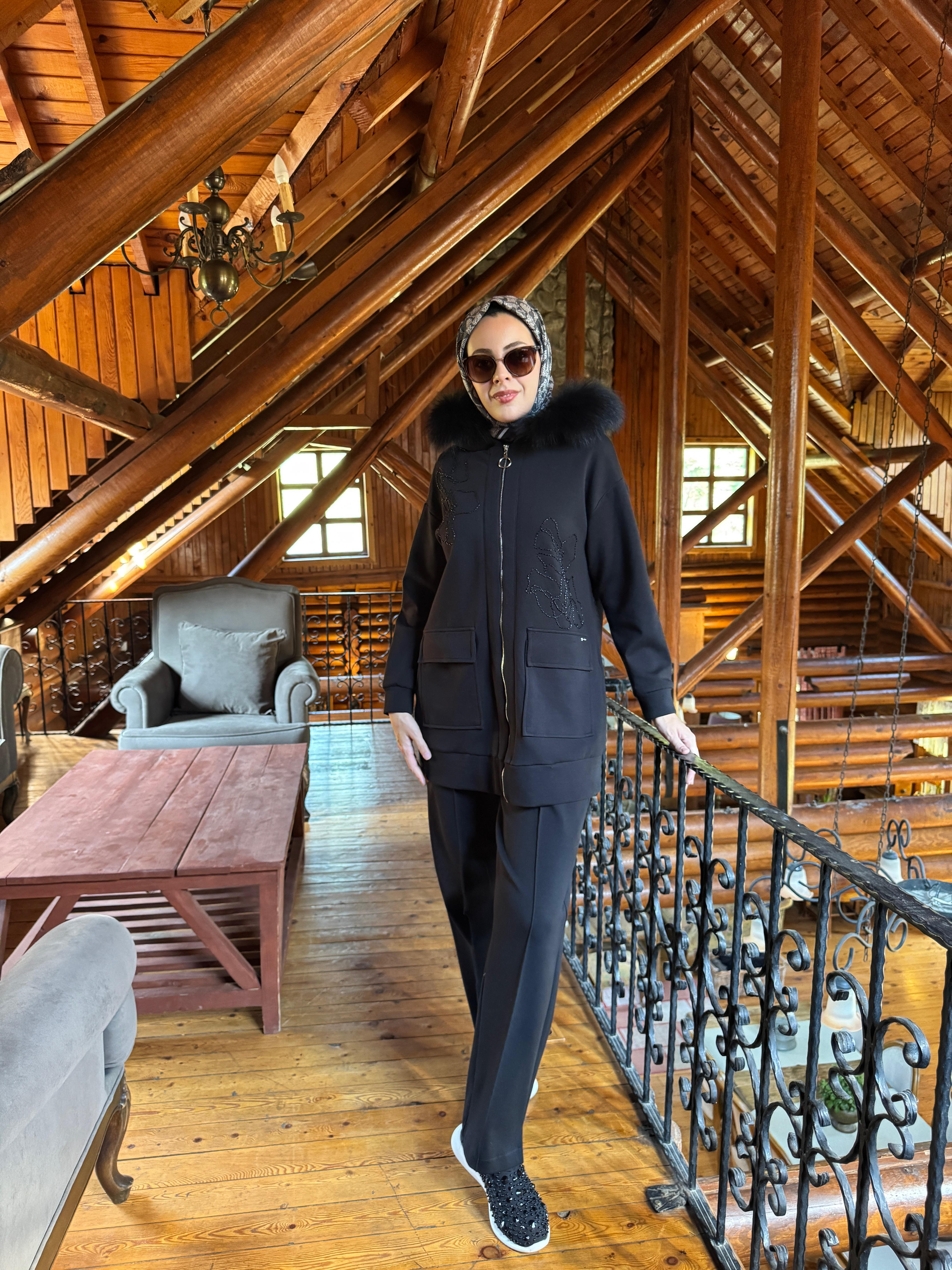 BONCUK NAKIŞLI KAPÜŞONLU KÜRKLÜ TAKIM