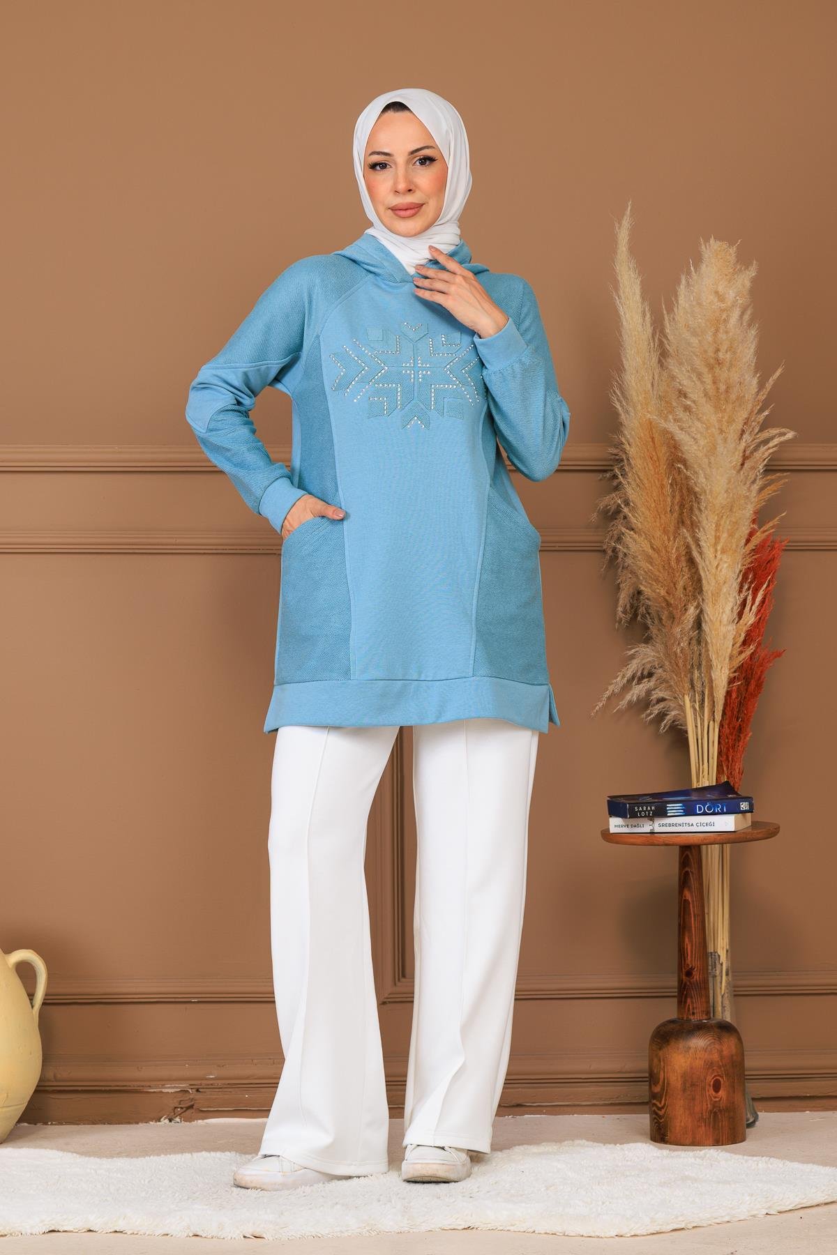 TAŞ APLİKELİ KAPÜŞONLU SWEATSHIRT